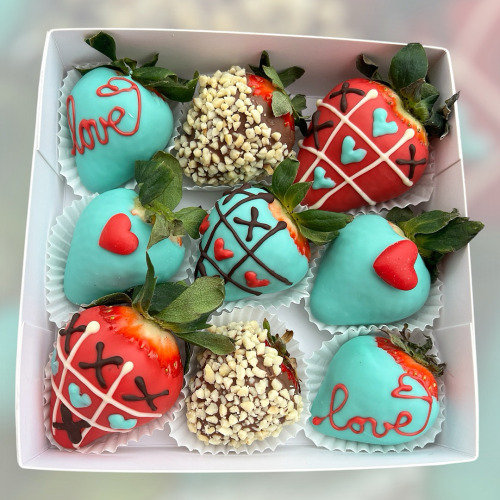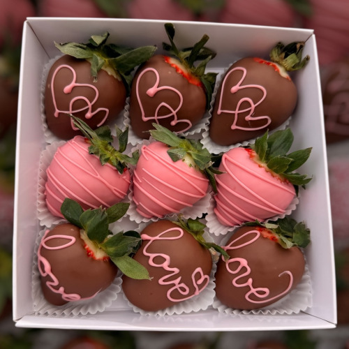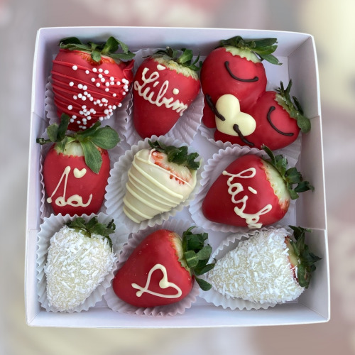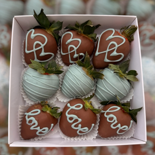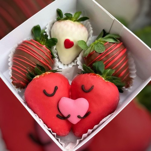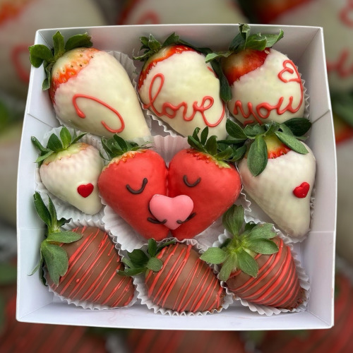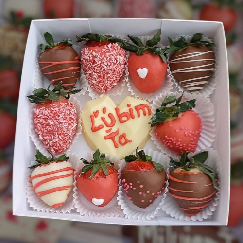 V bonboniérke je 8-10 ks jahôd a srdiečko s nápisom Ľúbim Ťa...
