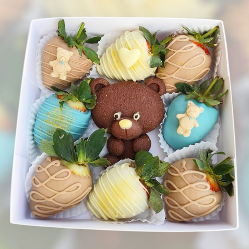V bonboniérke je 8-10 ks jahôd a čokoládový macko.