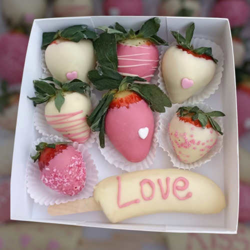 V bonboniérke je 7-9 ks jahôd a 1 banán S nápisom Love.