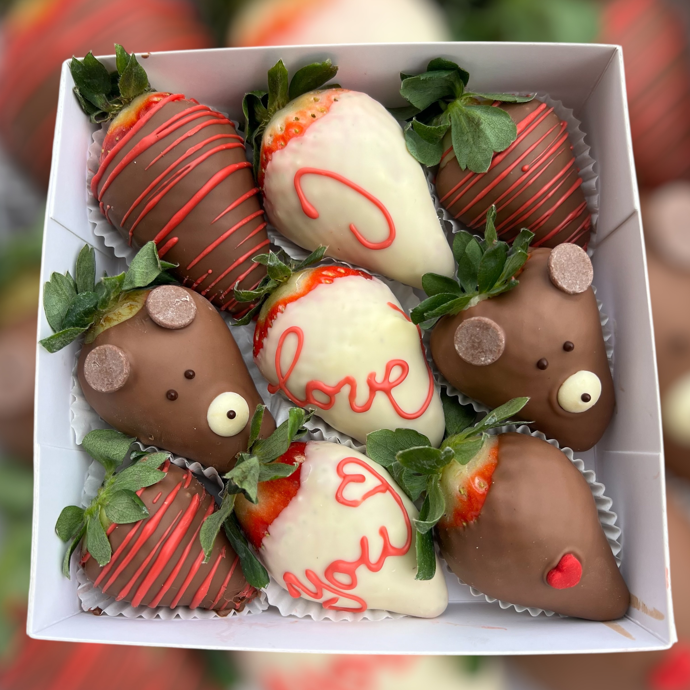 V bonboniérke je 8-10 ks jahôd a čokoládový macko.