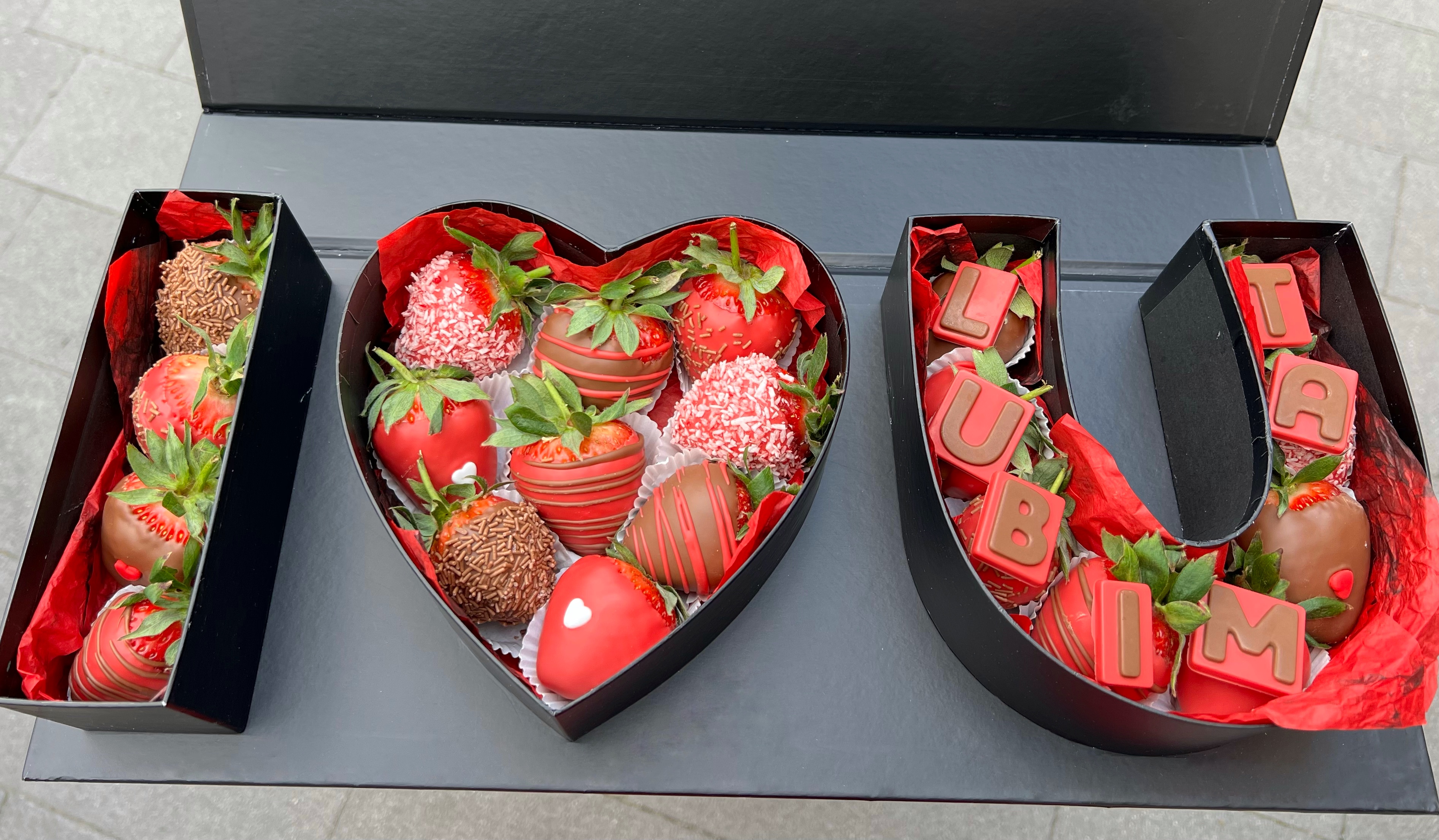 Box obsahuje 20-26 ks jahôd podľa veľkosti a nápis “LUBIM TA...
